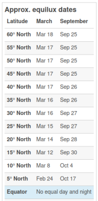A location's equilux dates depend on the latitude (Breedtegraad). Locations on or near the equator never experience equal day and night.